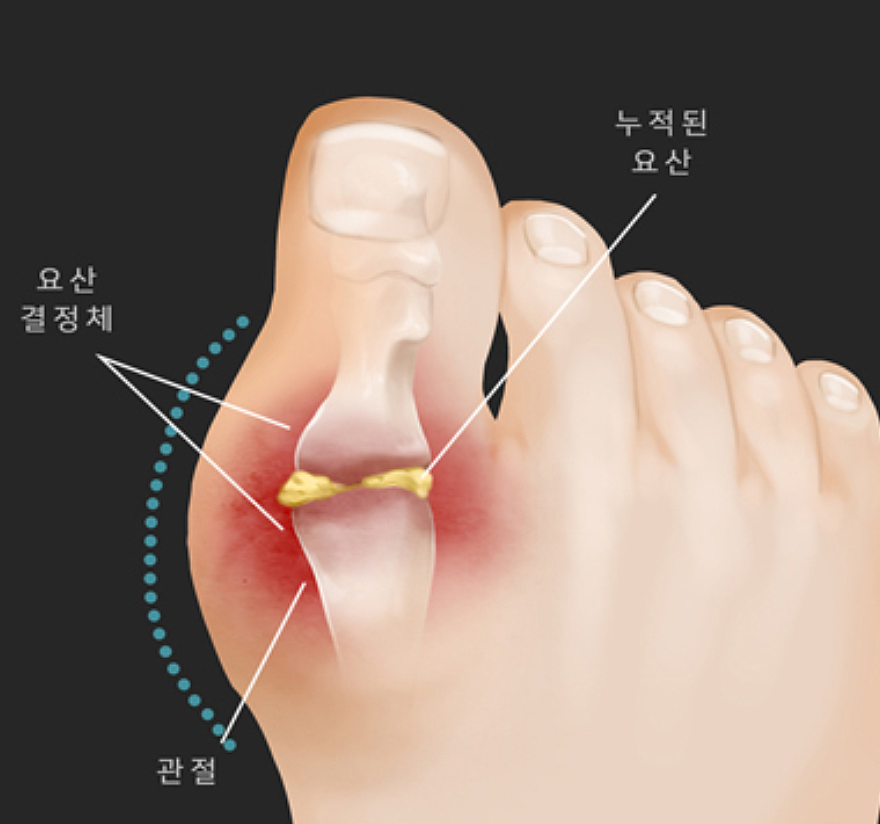 통풍은 단백질 중 퓨린 대사의 장애로 인해 그 분해산물인 요산이 결정체를 형성하여 바늘과 같이 뾰족한 모양의 '요산 결정'이 관절강 내에 침착하여 통증과 국소적인 염증반응을 일으키는데 관여 합니다.