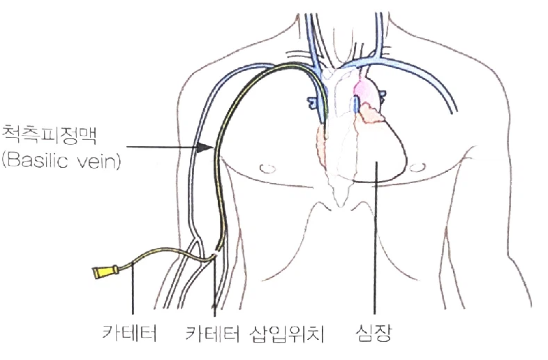 PICC는 Peripherally Inserted Central Catheter라고 하며 정맥을 통하여 삽입되는 도관(중심정맥)을 말합니다. 보통 팔(전완0의 척측피정맥(Basilic vein)을 통해서 상대정맥으로 카테터를 삽입합니다.