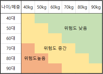 위의 골다공증 위험도 측정표에 따르면 나이가 많을수록 체중이 적을수록 골다공증 위험이 증가하고, 체중이 높으면 위험도가 낮은것을 확인할 수 있습니다. 나이가 들면 저체중이 되지 않도록 적정체중을 유지하는게 중요합니다.