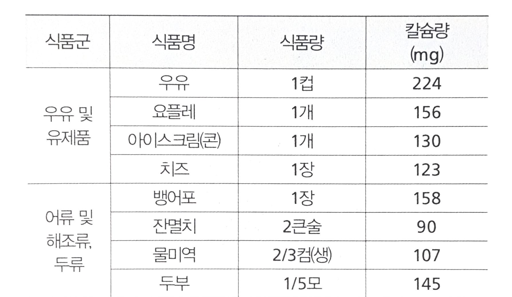 유제품: 우유,요플레,아이스크림,치즈(우유는 1컵당 칼슘량 224mg이 포함되어있습니다.)